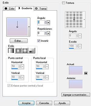 1. Paleta de estilos y texturas. Primer plano #ced8fb y plano de fondo #dbcad7. Gradiente. Lineal. Ángulo y repeticiones 0. Invertir. |